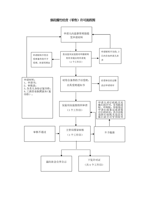《烟花爆竹安全管理条例》(国务院令455号发布,第666号修订)第三条 国家对烟花爆竹的生产、经营、运输和举办焰火晚会以及其他大型焰火燃放活动,实行许可证制度。未经许可,任何单位或者个人不得生产、经营、运输烟花爆竹,不得举办焰火晚会以及其他大型焰火燃放活动。《烟花爆竹安全管理条例》(国务院令第455号,第666号修订)第十九条第二款 申请从事烟花爆竹零售的经营者,应当向所在地县级人民政府安全生产监督管理部门提出申请,并提供能够证明符合本条例第十八条规定条件的有关材料。受理申请的安全生产监督管理部门应当自受理申请之日起20日内对提交的有关材料和经营场所进行审查,对符合条件的,核发《烟花爆竹经营(零售)许可证》;对不符合条件的,应当说明理由。第十八条 烟花爆竹零售经营者,应当具备下列条件:(一)主要负责人经过安全知识教育;(二)实行专店或者专柜销售,设专人负责安全管理;(三)经营场所配备必要的消防器材,张贴明显的安全警示标志;(四)法律、法规规定的其他条件。 |