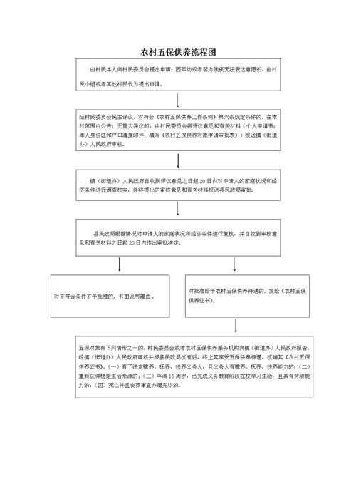 实施依据 《农村五保供养工作条例》(国务院令第456号)第七条 享受农村五保供养待遇,应当由村民本人向村民委员会提出申请;因年幼或者智力残疾无法表达意愿的,由村民小组或者其他村民代为提出申请。经村民委员会民主评议,对符合本条例第六条规定条件的,在本村范围内公告;无重大异议的,由村民委员会将评议意见和有关材料报送乡、民族乡、镇人民政府审核。乡、民族乡、镇人民政府应当自收到评议意见之日起20日内提出审核意见,并将审核意见和有关材料报送县级人民政府民政部门审批。县级人民政府民政部门应当自收到审核意见和有关材料之日起20日内提出审核意见,并将审核意见和有关材料报送县级人民政府民政部门审批。县级人民政府民政部门应当自收到审核意见和有关材料之日起20日内作出审批决定。对批准给予农村五保供养待遇的,发给《农村五保供养证书》;对不符合条件不予批准的,应当书面说明理由。乡、民族乡、镇人民政府应当对申请人的家庭状况和经济条件进行调查核实;必要时,县级人民政府民政部门可以进行复核。申请人、有关组织或者个人应当配合、接受调查,如实提供有关情况。第八条 农村五保供养对象不再符合本条例第六条规定条件的,村民委员会或者敬老院等农村五保供养服务机构(以下简称农村五保供养服务机构)应当向乡、民族乡、镇人民政府报告,由乡、民族乡、镇人民政府审核并报县级人民政府民政部门核准后,核销其《农村五保供养证书》。农村五保供养对象死亡,丧葬事宜办理完毕后,村民委员会或者农村五保供养服务机构应当向乡、民族乡、镇人民政府报告,由乡、民族乡、镇人民政府报县级人民政府民政部门核准后,核销其《农村五保供养证书》。第六条 老年、残疾或者未满16周岁的村民,无劳动能力、无生活来源又无法定赡养、抚养、扶养义务人,或者其法定赡养、抚养、扶养义务人无赡养、抚养、扶养能力的,享受农村五保供养待遇。