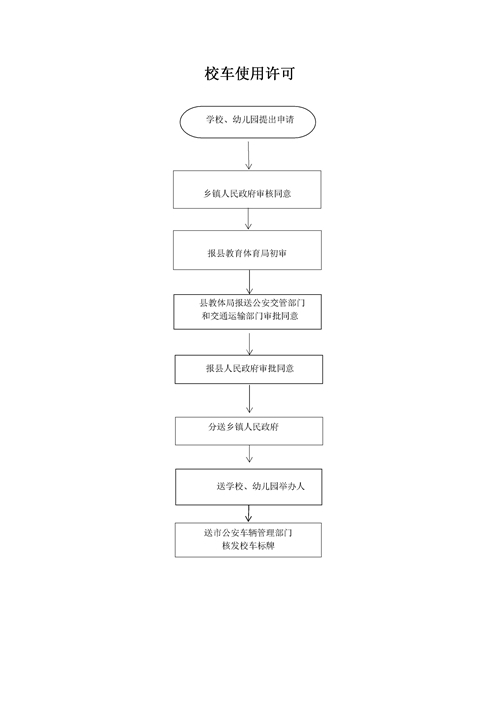 《校车安全管理条例》(国务院令第617号)第十五条 学校或者校车服务提供者申请取得校车使用许可,应当向县级或者设区的市级人民政府教育行政部门提交书面申请和证明其符合本条例第十四条规定条件的材料。教育行政部门应当自收到申请材料之日起3个工作日内,分别送同级公安机关交通管理部门、交通运输部门征求意见,公安机关交通管理部门和交通运输部门应当在3个工作日内回复意见。教育行政部门应当自收到回复意见之日起5个工作日内提出审查意见,报本级人民政府。本级人民政府决定批准的,由公安机关交通管理部门发给校车标牌,并在机动车行驶证上签注校车类型和核载人数;《校车安全管理条例》(国务院令第617号)第十五条 学校或者校车服务提供者申请取得校车使用许可,应当向县级或者设区的市级人民政府教育行政部门提交书面申请和证明其符合本条例第十四条规定条件的材料。教育行政部门应当自收到申请材料之日起3个工作日内,分别送同级公安机关交通管理部门、交通运输部门征求意见,公安机关交通管理部门和交通运输部门应当在3个工作日内回复意见。教育行政部门应当自收到回复意见之日起5个工作日内提出审查意见,报本级人民政府。本级人民政府决定批准的,由公安机关交通管理部门发给校车标牌,并在机动车行驶证上签注校车类型和核载人数;不予批准的,书面说明理由。第十四条 使用校车应当依照本条例的规定取得许可。取得校车使用许可应当符合下列条件:(一)车辆符合校车安全国家标准,取得机动车检验合格证明,并已经在公安机关交通管理部门办理注册登记;(二)有取得校车驾驶资格的驾驶人;(三)有包括行驶线路、开行时间和停靠站点的合理可行的校车运行方案;(四)有健全的安全管理制度;(五)已经投保机动车承运人责任保险。 |