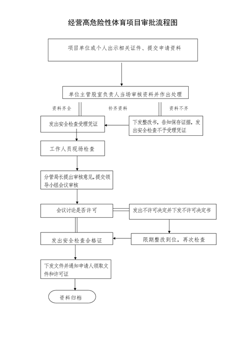 经营高危险性体育项目的,应当符合下列条件,并向县级以上人民政府体育主管部门提出申请:(一)相关体育设施符合国家标准;(二)具有达到规定数量的取得国家职业资格证书的社会体育指导人员和救助人员;(三)具有相应的安全保障制度和措施。县级以上人民政府体育主管部门应当自收到申请之日起30日内进行实地核查,做出批准或者不予批准的决定。批准的,应当发给许可证;不予批准的,应当书面通知申请人并说明理由。 |