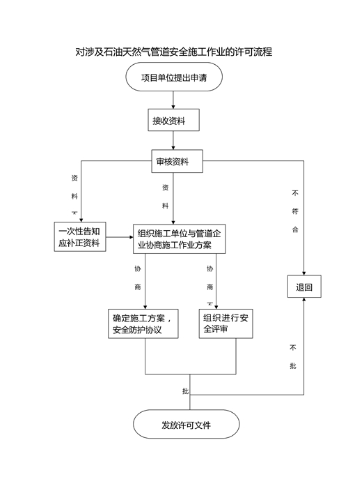 施工企业提供:1.施工企业作业资质证明文件;2.具有符合管道安全和公共安全要求的施工作业方案;3.已制定事故应急预案;4.施工作业人员具备管道保护知识和相关资格;4.具有保障安全施工作业的设备、设施。5.施工安全风险评估方案。 |