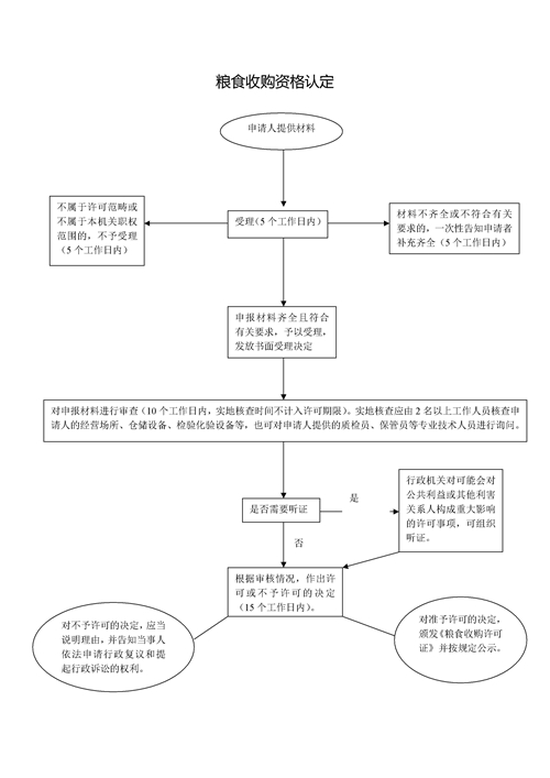 《粮食流通管理条例》(国务院令第407号公布、638号、666号)第九条依照《中华人民共和国公司登记管理条例》等规定办理登记的经营者,取得粮食收购资格后,方可从事粮食收购活动。申请从事粮食收购活动,应当向办理工商登记的部门同级的粮食行政管理部门提交书面申请,并提供资金、仓储设施、质量检验和保管能力等证明资料。粮食行政管理部门应当自受理之日起15个工作日内完成审核,对符合本条例第八条规定具体条件的申请者作出许可决定并公示。 |