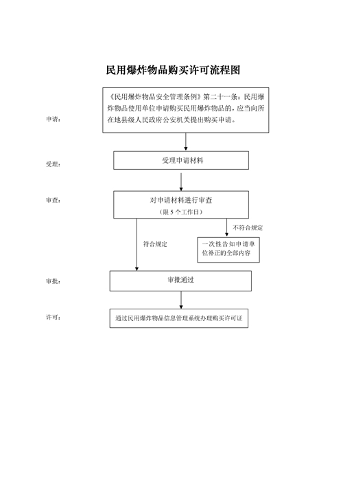 《民用爆炸物品安全管理条例》(国务院令第466号发布,第653号修订)第二十一条第一款 民用爆炸物品使用单位申请购买民用爆炸物品的,应当向所在地县级人民政府公安机关提出购买申请,并提交下列有关材料: |