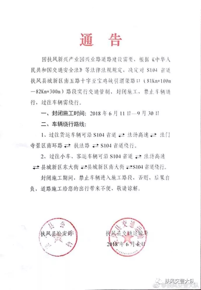 关于对104省道扶风县城新区南五路十字至宝鸡峡引渭渠路口路段实行交通管制的通告