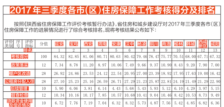 依据《陕西省住房保障工作评价考核办法》,我省在各市(区)上报数据的基础上,结合巡查情况,按照开工情况、保障房入住情况以及棚改贷款情况,对各市(区)三季度进展情况进行了考核排名。排名依次为延安、宝鸡、西安、渭南、安康、汉中、杨凌、铜川、商洛、榆林、韩城、西咸新区、咸阳。