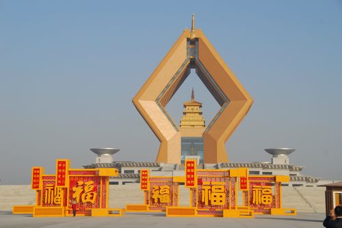 2006年,新组建的法门寺文化景区按照“千载佛家圣地,万世人文经典”的定位,巨资打造一流景观、一流文化、一流环境、一流服务的世界级景区,主体建筑合十舍利塔高148 米,匠心独具、庄严肃穆,宽108米、长1230米的佛光大道,十万人广场使景区更显规模宏大、气势恢弘。绚丽多彩、如梦似幻的灯光设计使景区呈现出“穷天上之庄严、极人间之焕丽”的景观效果。