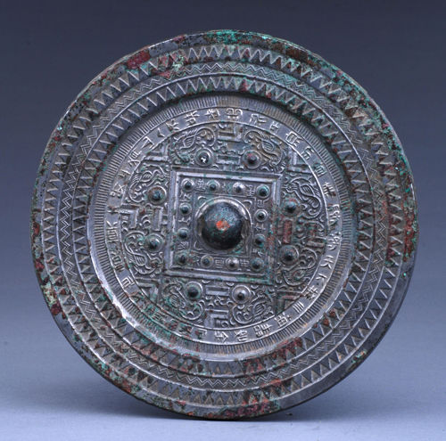 1974年出土于扶风县新店乡万杨村,直径15.5厘米,重600克,三级文物。形制和太山仙人镜相类,边缘饰有波折纹和锯齿纹相间的装饰。外区有顺时针旋读铭文一周:“王氏作竟(镜)真大好,上有仙人不知老,渴饮玉泉饥食枣,浮游天下敖四海,寿如金石为国保。”《史记·孝武本纪》记载,汉武帝崇信神仙,追求长寿之法,效法黄帝故事的行为,到了沉迷其中不能自拔的地步。该铜镜的铭文正是对当时盛行慕仙崇道社会风气的真实反映。