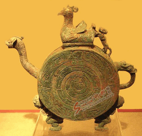 电视剧《芈月传》中,楚王和他的宠妃饮酒,桌上摆放了一件酒器盉( hé),其原型为山西博物院的鸟盖人足盉。青铜盉是古代盛酒或水的器皿,形状多样,一般是深腹、有盖,三足或四足。商周盉多后有执鋬,或在盉口下两侧置贯耳;而春秋战国时期,盉上多设提梁,即所谓提梁盉。